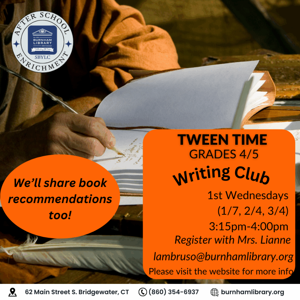 Register with Mrs. Lianne at lambruso@burnhamlibrary.com