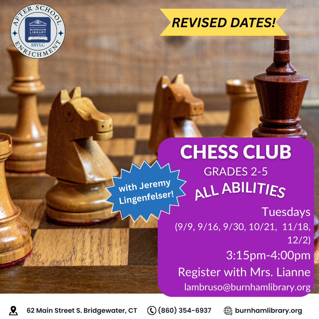Burnham Library Presents: Chess Club Grades 2-5 Tuesday 3:5-4:00pm Jeremy Lingenfelser will host a kids Chess Club. Beginners will learn the classic game of Chess and those who are experienced players will learn some new strategies. Registration required. Please register with Mrs. Lianne at lambruso@burnhamlibrary.org. |