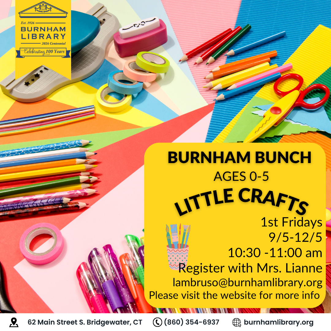 Burnham Library Presents: Burnham Bunch Little Crafts 1st Fridays of the month (9/5-12/5) 10:30am-11:00am For ages 5 and under. Join us for simple, seasonal crafts for little hands and their…