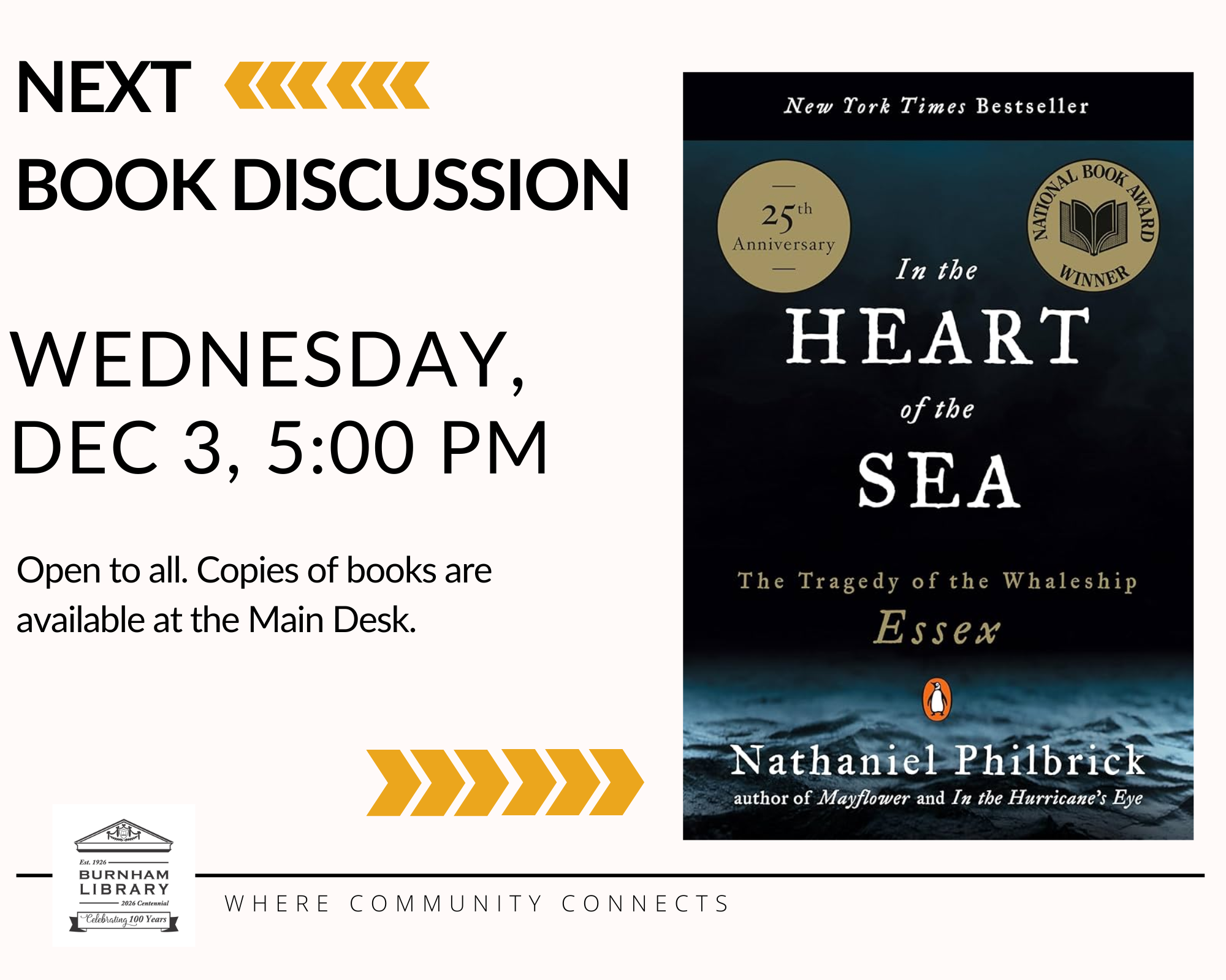 Join us as we discuss Heart of the Sea by Nathanial Philbrick. Copies available at the library circulation desk. Questions? Contact jkallay@burnhamlibrary.org |