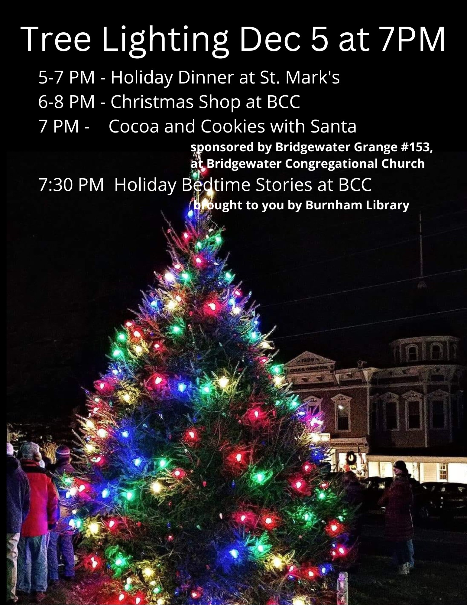 Bridgewater Town Tree Lighting Join us for Bridgewater’s annual Town Tree Lighting celebration! 🌟 5:00 - 7:00 pm • Holiday Dinner at St. Mark's Church 6:00 - 8:00 pm •… |