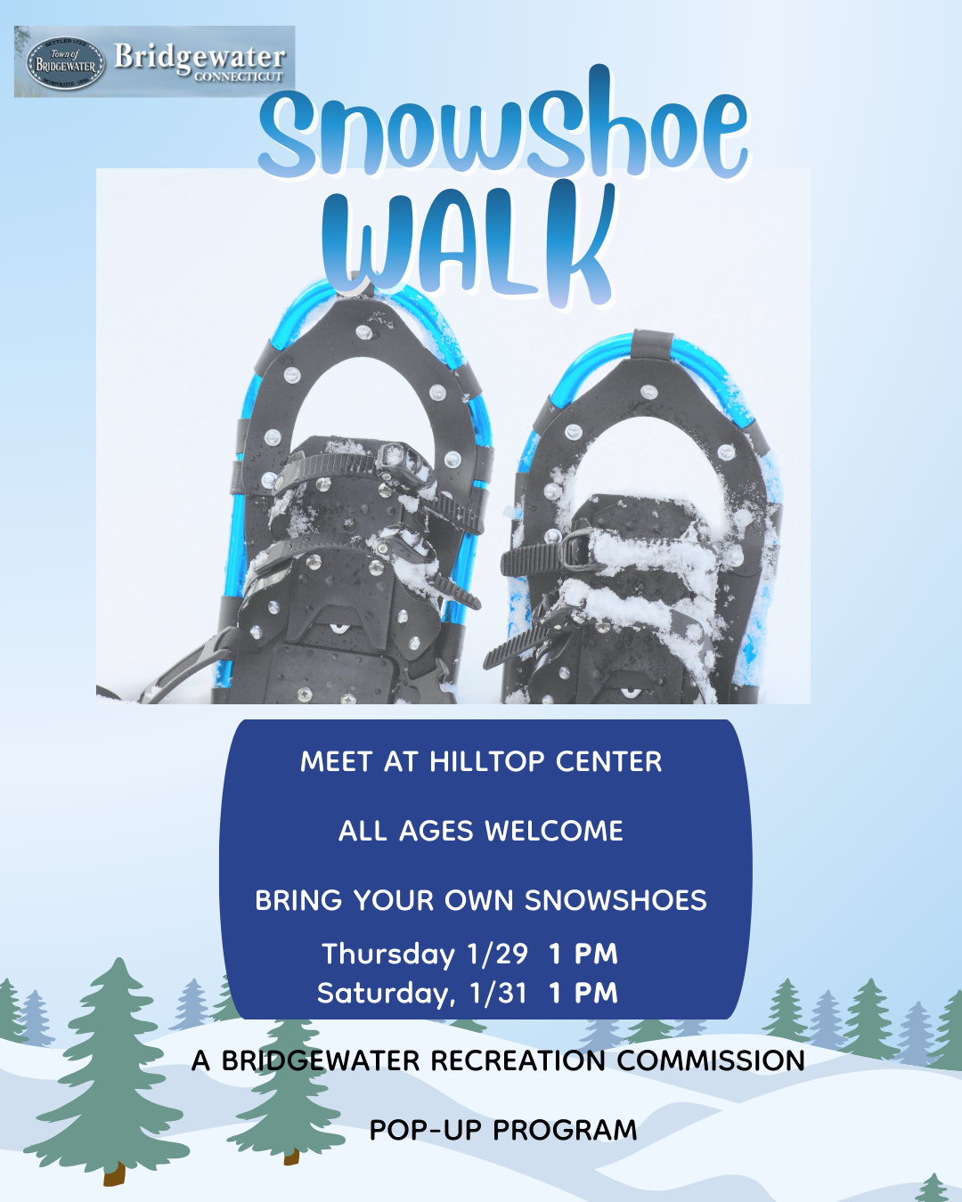 Bridgewater Recreation Commission Snowshoe Walk Pop-Up Meet at the Hilltop Center Thursday, January 29 and Saturday January 31 at 1:00 pm All ages welcome Bring your own snowshoes. |