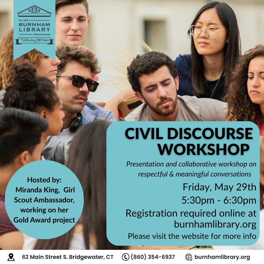 Civil Discourse Workshop Friday, May 29th from 5:30 - 6:30 pm Registration required. RSVP Below A presentation and collaborative workshop about civil discourse. Learn from host Miranda King about constructive…