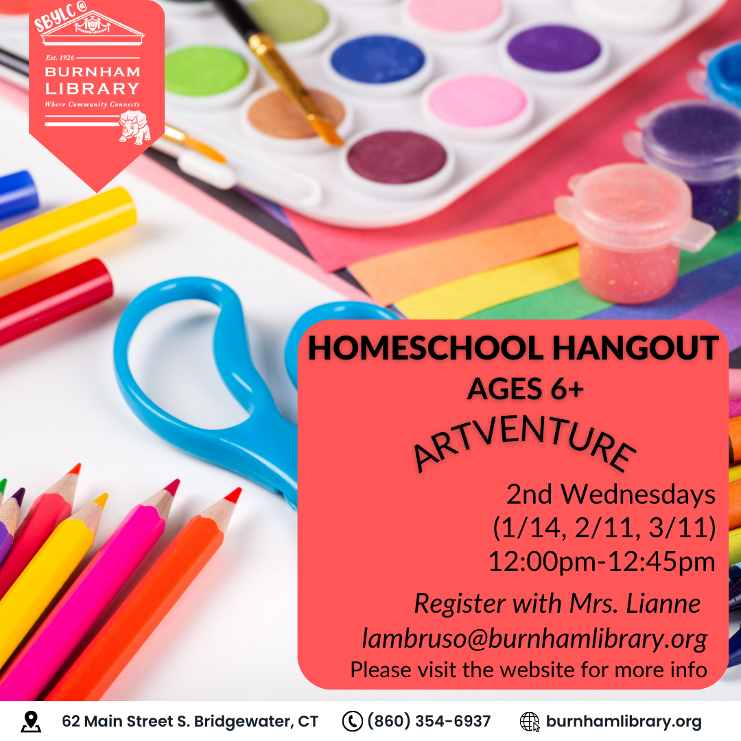 Burnham Library Presents: Tween Time (grades 4/5) Writing & Book Club 1st Wednesdays (1/7, 2/4, 3/4) 3:15pm-4:00pm Spend some time after school writing stories, poems & comics. There will be a new prompt each session or work on your own creative piece. We will share book recommendations as well! Registration required. Email Mrs. Lianne at…