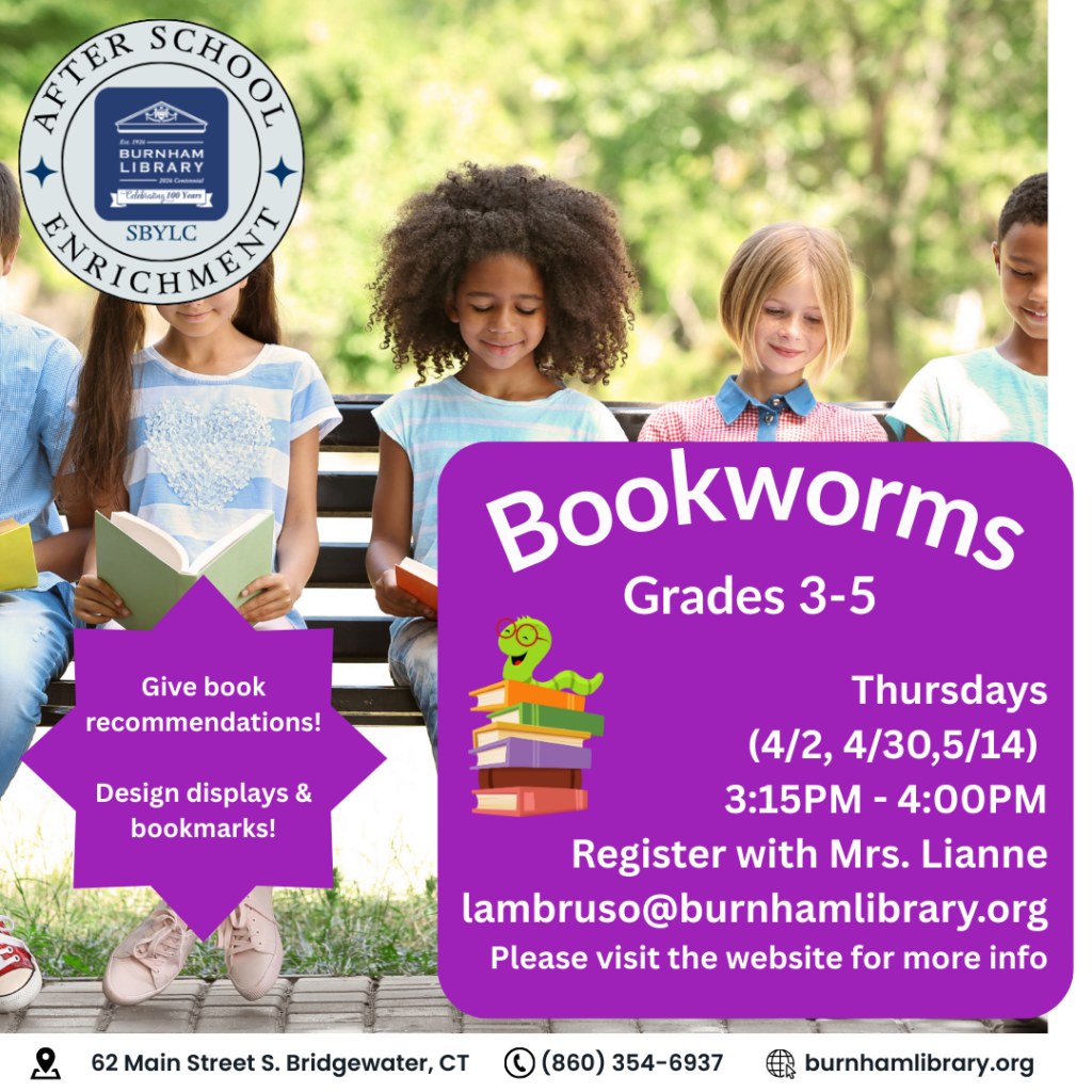 Registration required. To register, email Mrs. Lianne at lambruso@burnhamlibrary.org.