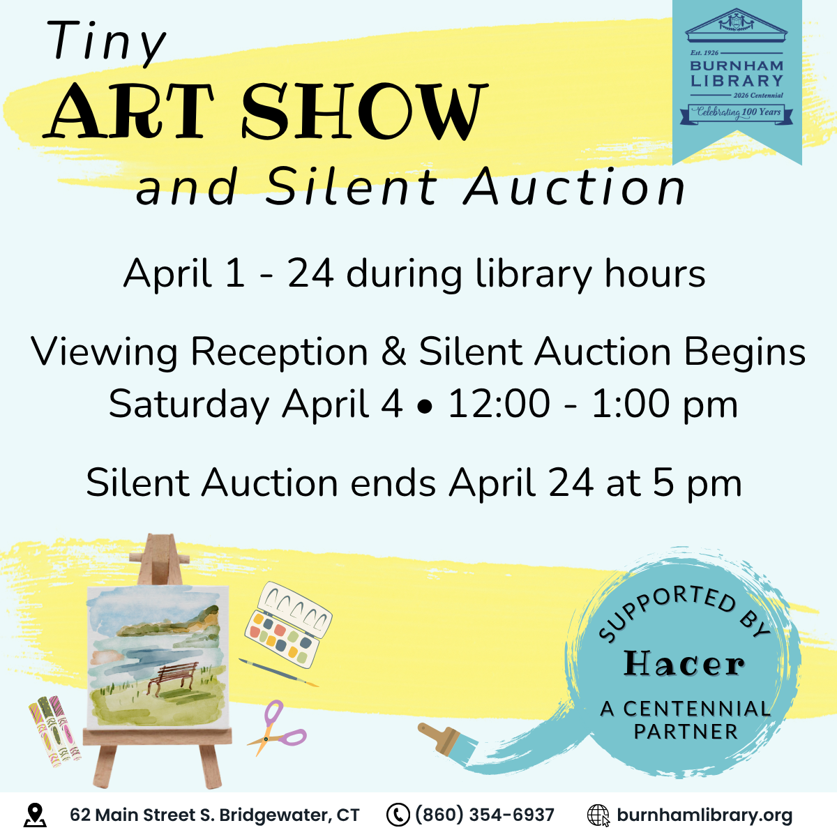 The Burnham Library 62 Main Street South, Burnham Library, Bridgewater, CT, United StatesAll AgesTiny Art Show & Auction Reception All are welcome to attend the Tiny Art Show & Auction Reception.Come view dozens of original tiny artworks created by local artists and community…