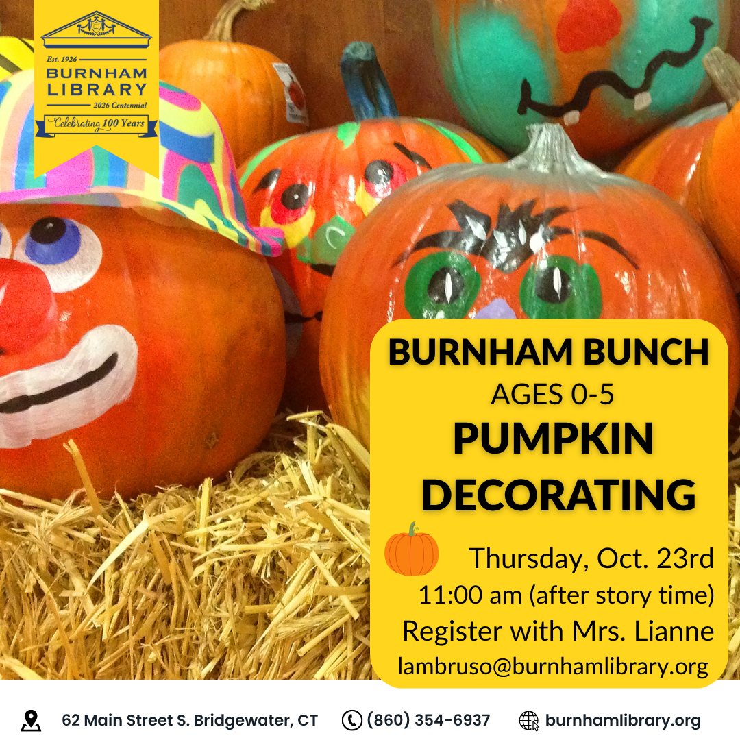 Burnham Library presents: PK Pumpkin Decorating Thursday, October 23rd 11:00am-11:30am (directly after Story time) Get creative and decorate your small pumpkin with stickers, markers, etc. Make it scary or silly. For ages 5 and under with their caretaker. Registration required. To register, please email Mrs. Lianne at lambruso@burnhamlibrary.org.