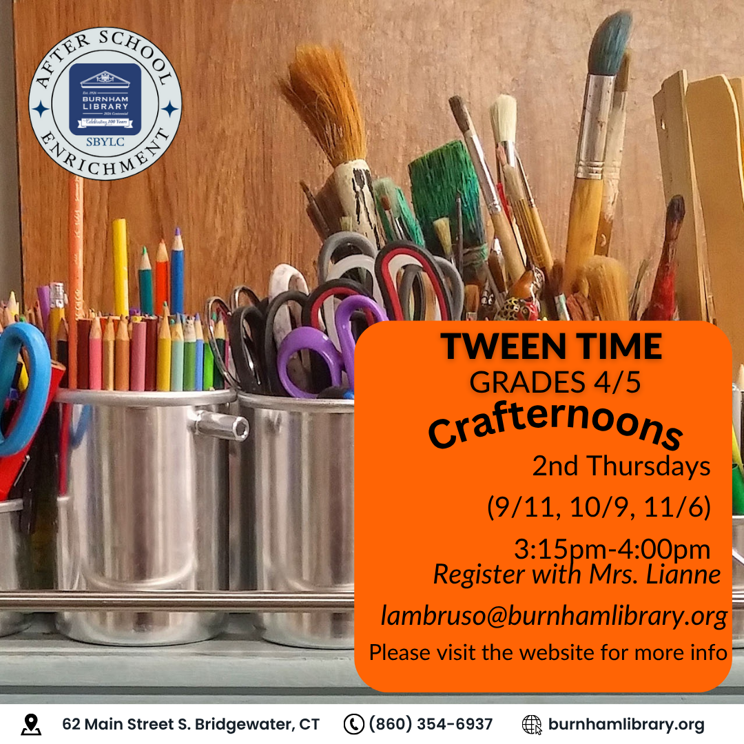 Burnham Library Presents: Tween Time Crafternoons 2nd Thursdays (September - November) 3:15pm-4:00pm Grades 4/5 Crafts for the upper elementary group including friendship bracelets, painting and more! Registration required. To register,…