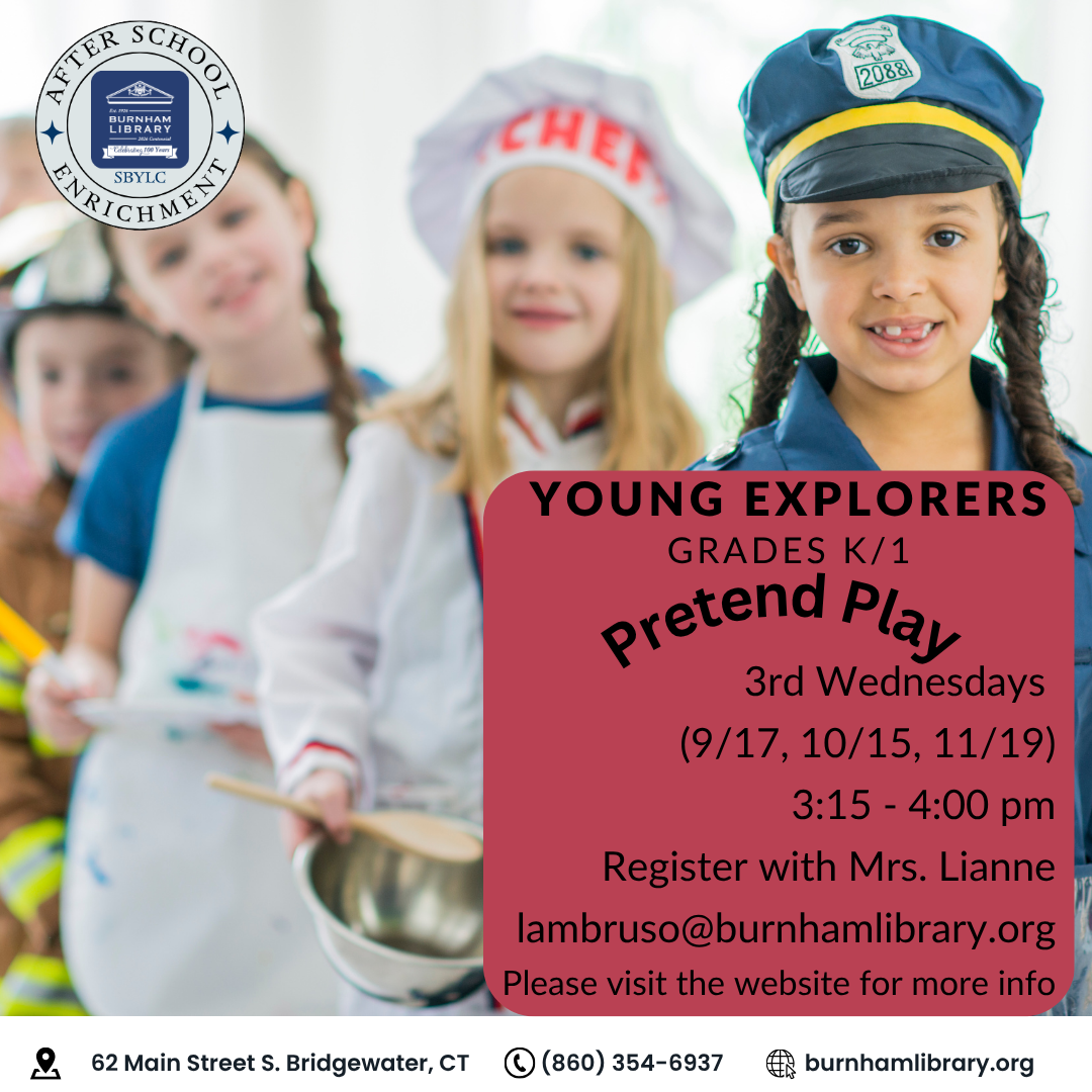 Burnham Library Presents: Young Explorers- Pretend Play 3rd Wednesdays (September- November) 3:15pm-4:00pm Grades K/1 Afterschool play time with our dramatic play sets as well as our grocery store and kitchen sets! Registration required. To register, email Mrs. Lianne at lambruso@burnhamlibrary.org.