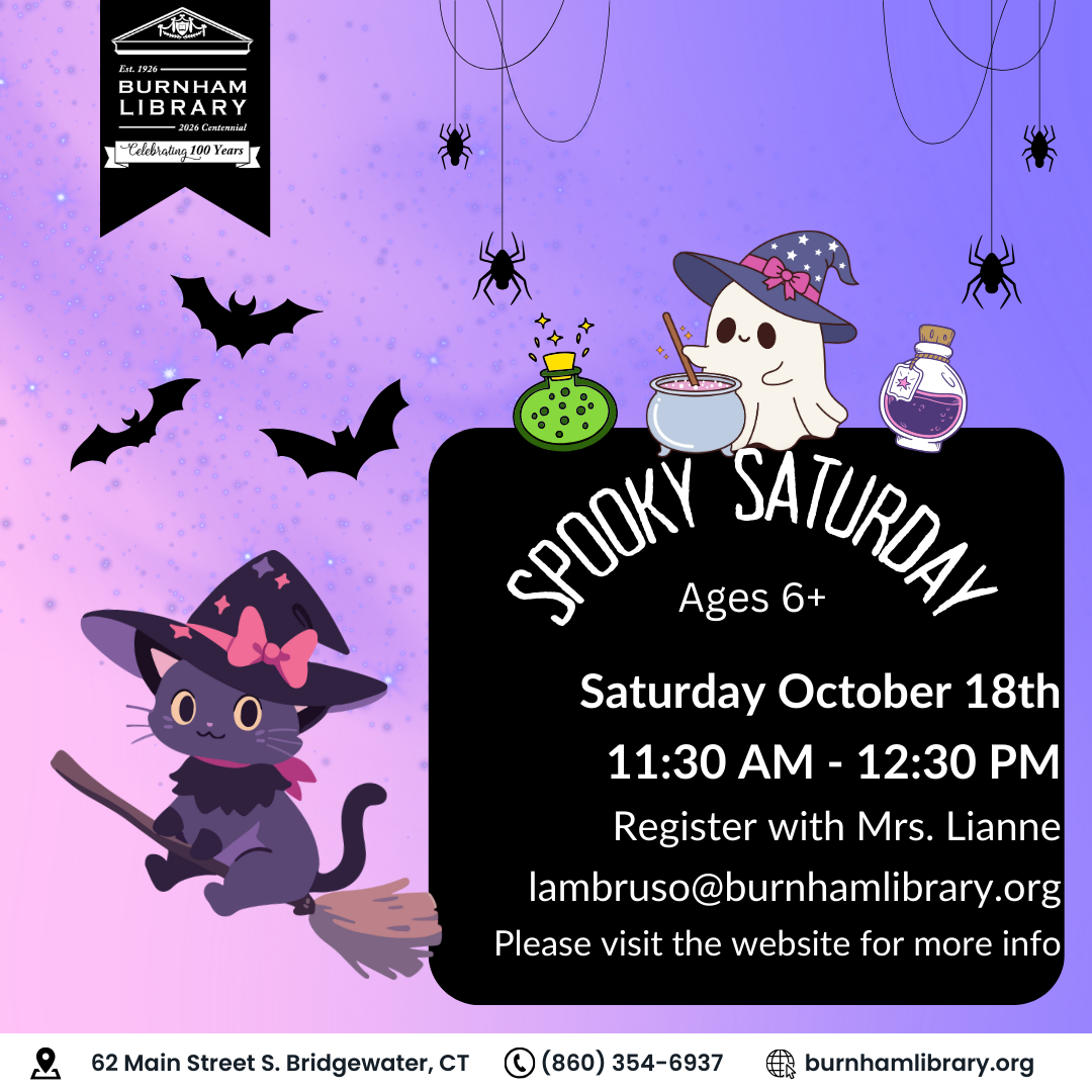 Burnham Library Presents: Spooky Saturday For Ages 6+ Saturday, October 18th 11:30am-12:30pm (drop off event) Join us for some spooky fun! See a potion demonstration and make your own potions! Decorate your own haunted house as well as your very own clay familiar (witch's companion). Witch and wizard attire encouraged! Registration required. Please email Mrs.…