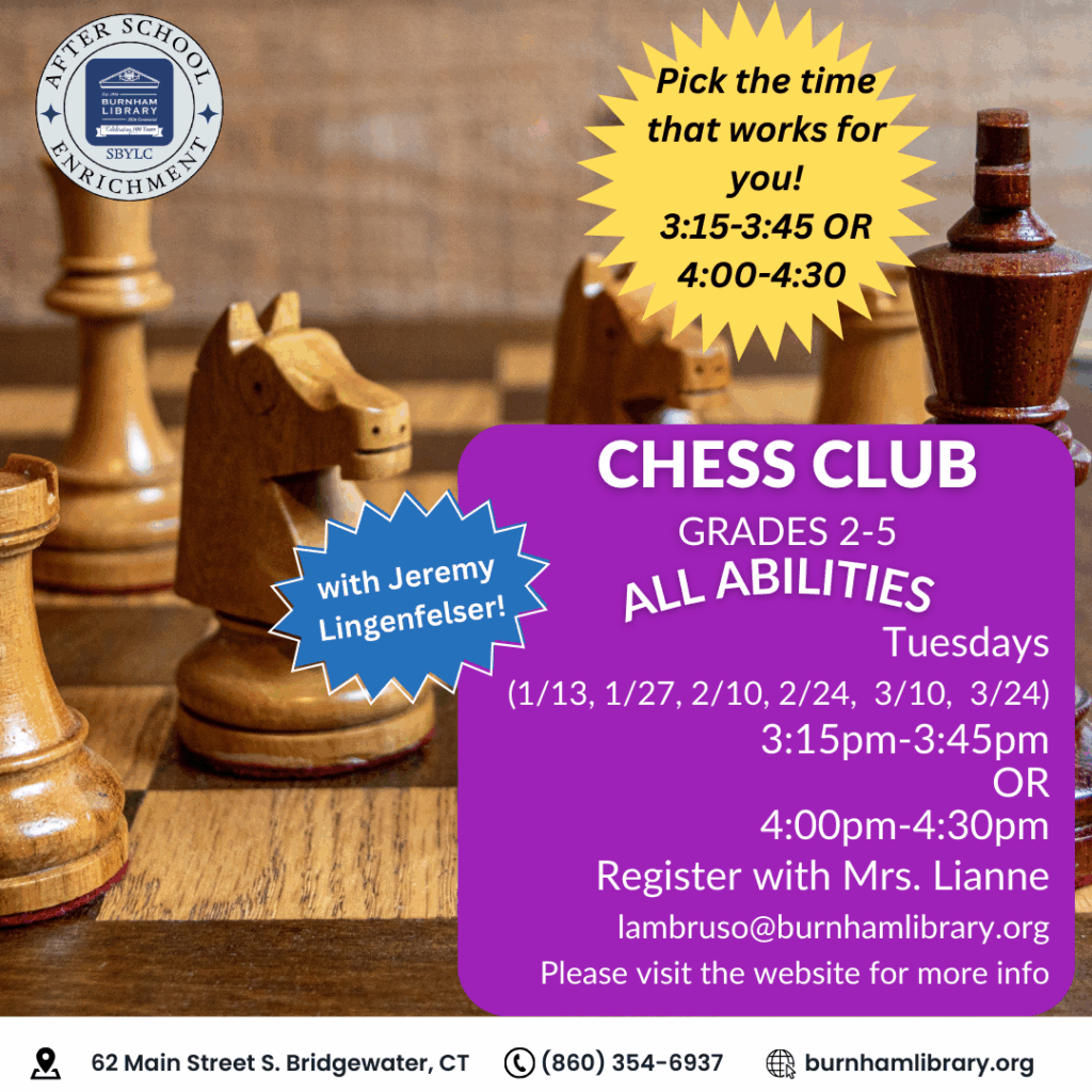 Registration required. Email Mrs. Lianne at lambruso@burnhamlibrary.org