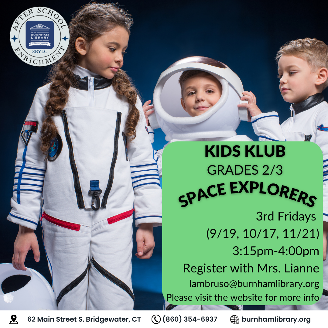 Burnham Library Presents: Kids Klub- Space Explorers 3rd Fridays (September0 November) 3:15pm-4:00pm Grades 2/3 Each month, kids will make and create space themed crafts/challenges. Registration required. To register, email Mrs. Lianne at lambruso@burnhamlibrary.org.