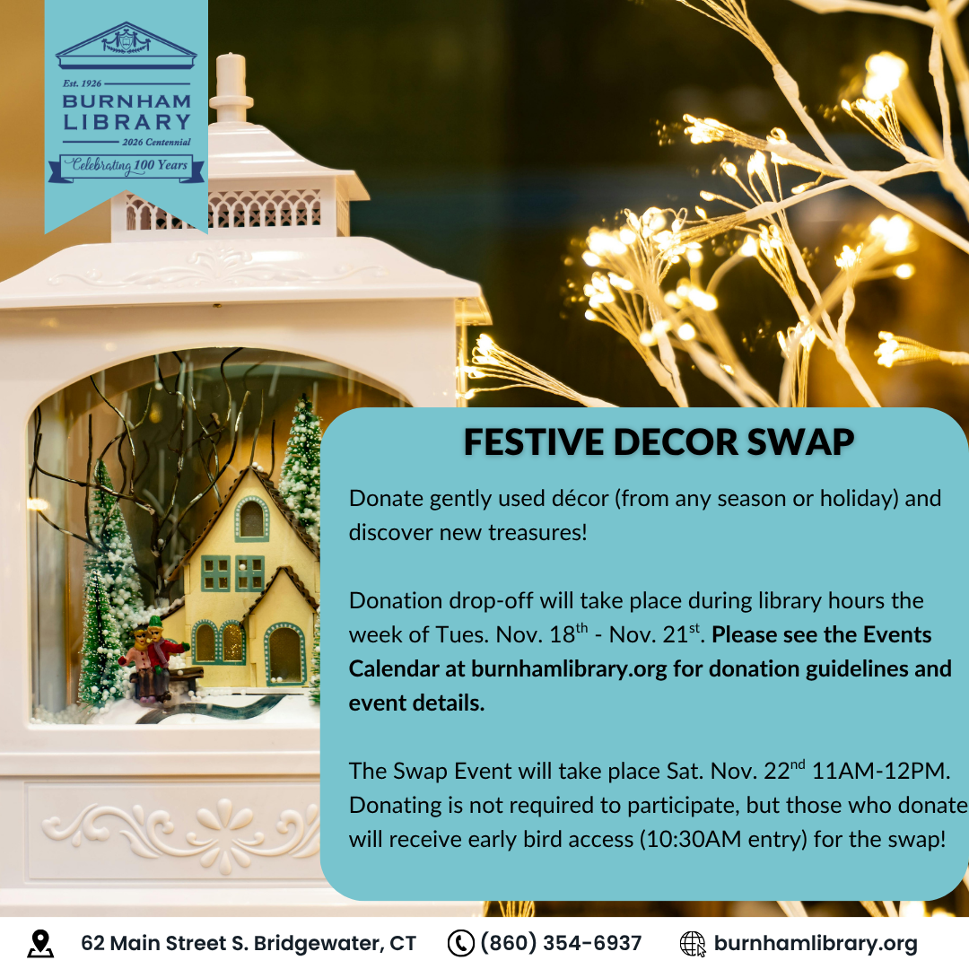 Donate gently used décor (from any season or holiday) and discover new treasures! Donation drop-off will take place during library hours the week of Tues. Nov. 18th - Nov. 21st. Please bring all donations to the circulation desk (in a bag or box if there are more than a few items). All decor items must…